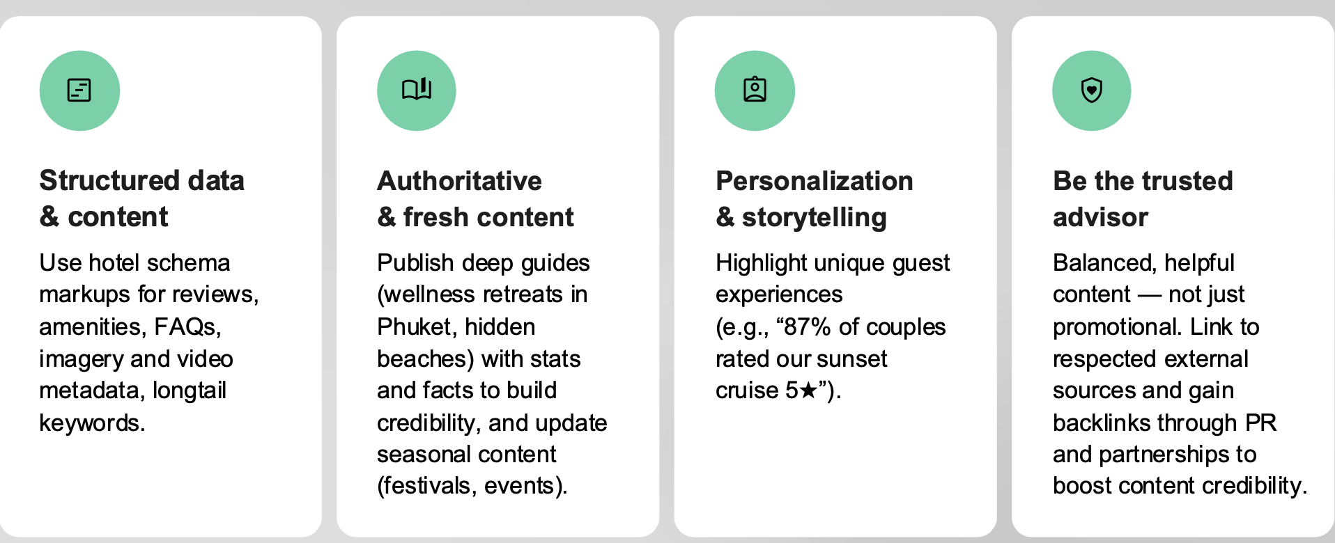 Hotels must therefore invest in digital PR, local partnerships, and credible storytelling, ensuring that their property is featured where AI engines are looking for context.